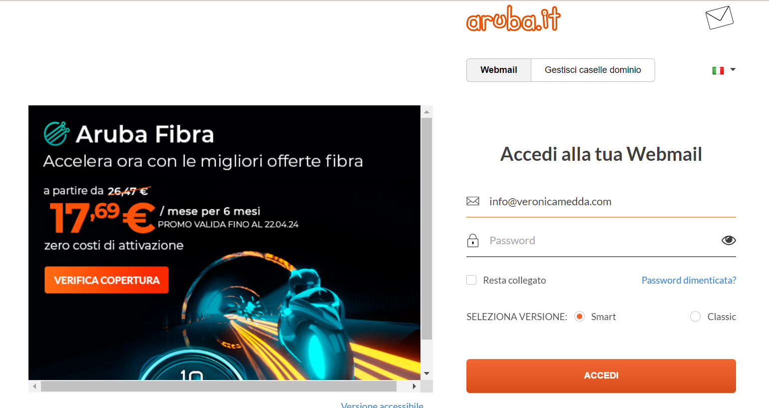 Per accedere da computer ti basterà digitare su Google https://webmail.aruba.it/ oppure cliccare su questo link e ti apparirà questa schermata: